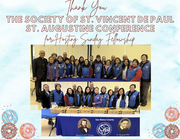 This coming Sunday, members Saint Vincent de Paul will do the honor of serving Hospitality. Come and greet fellow parishioners after the 9:00AM Mass on Sunday with freshly brewed coffee and donuts.