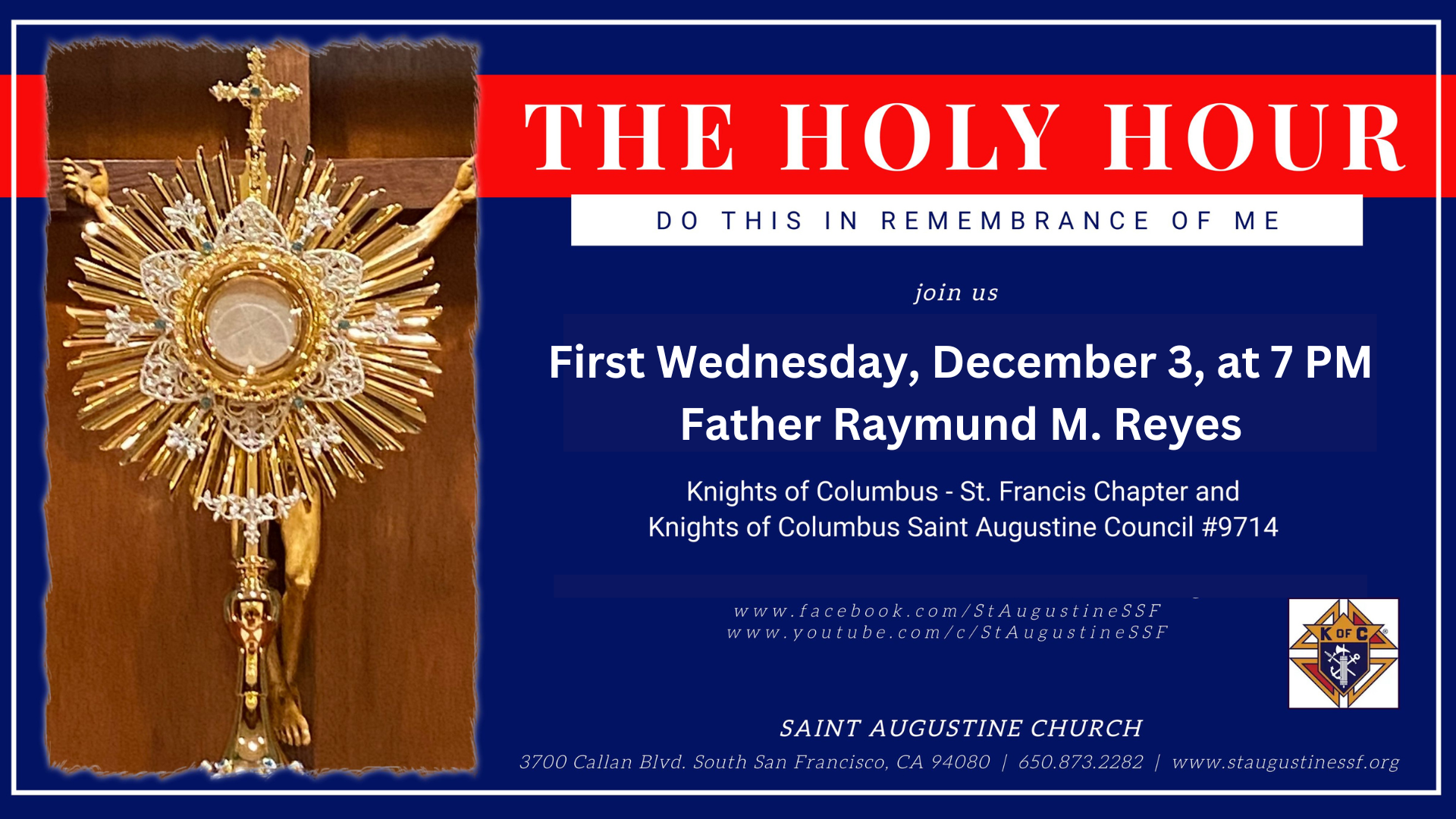 Every Friday, the Blessed Sacrament is exposed for public Adoration after the 9:00am Mass until 5:00PM. It is usually concluded with silent reposition and Benediction on First Fridays.