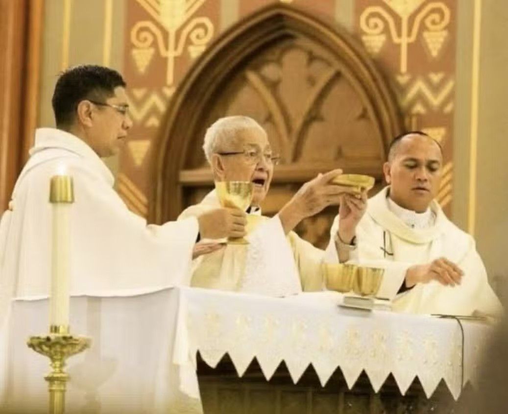 Fr. Francis Garbo (left) and Fr. Ray Reyes (right) concelebrate Mass with their mentor Monsignor Fred Bitanga, one of the first Filipino pastors in the Archdiocese of San Francisco. Photo from Fr. Mark Reburiano